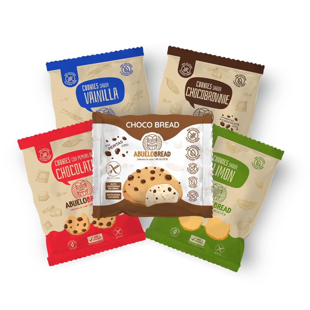 Box of 10 bags of sweet. Includes: 2 bags of lemon cookies (150g/bag) + 2 bags of chocolate chip cookies (150g/bag) + 2 bags of chocobrownie cookies (150g/bag) + 2 bags of vanilla cookies (150g/bag) + 2 Choco Breads (60g/bag).